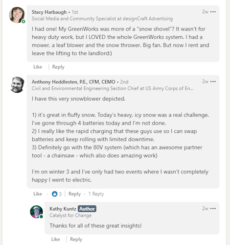 Then, a couple of weeks ago, a colleague of mine posted a story on LinkedIn about an electric snow blower. It seemed like fate. I re-posted the link, asking my network to share their experiences with electric snow blowers. Almost immediately I got some great insights, insights moved us a step closer to an electric solution.